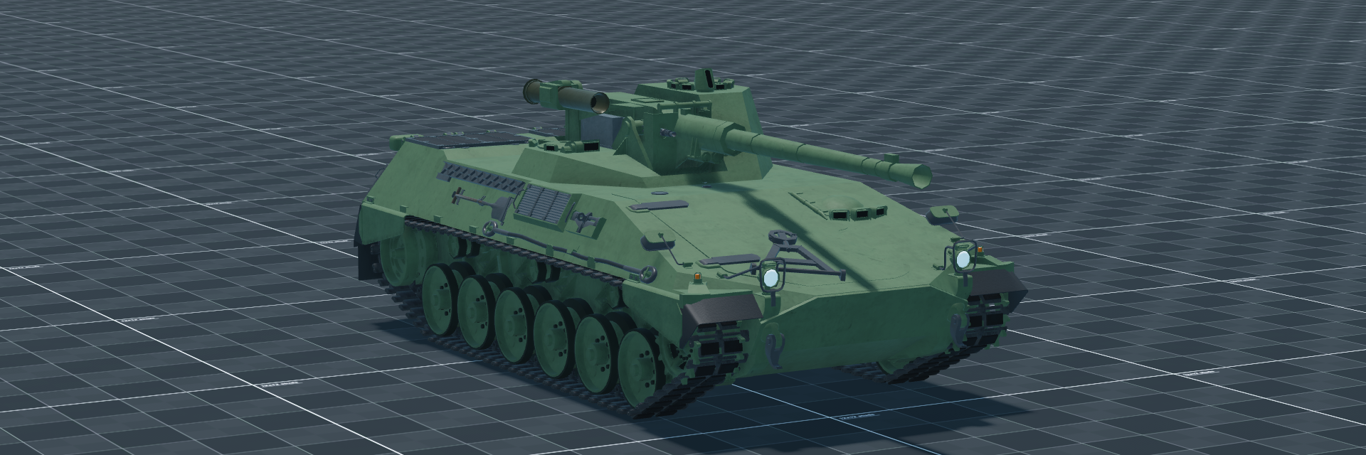 - The Begleitpanzer 57 is an Infantry Fighting Vehicle built on the chassis of the German Marder IFV, conceived to escort Leopard 2 tanks and engage light armour, helicopters, and infantry with a rapid-fire cannon and anti-tank missiles. The real-world Begleitpanzer 57 was a West German 1980s project that never entered serial production; the design combined a Bofors 57mm L/70 in a fully stabilized turret with TOW missiles for a flexible fire-support role. Operated by a crew of three — driver, gunner, and commander — on a tracked hull weighing 28.5 tonnes, it is powered by an MTU MB 833 Ea-500 diesel producing 600 horsepower for a 21.1 hp/t power-to-weight ratio and a top speed of 75 km/h in both directions.