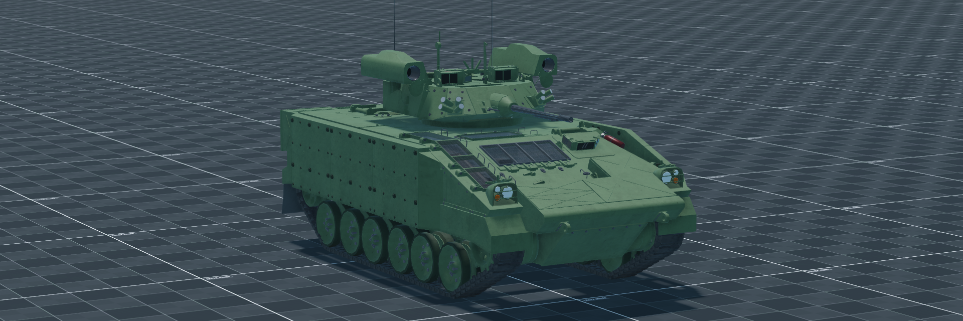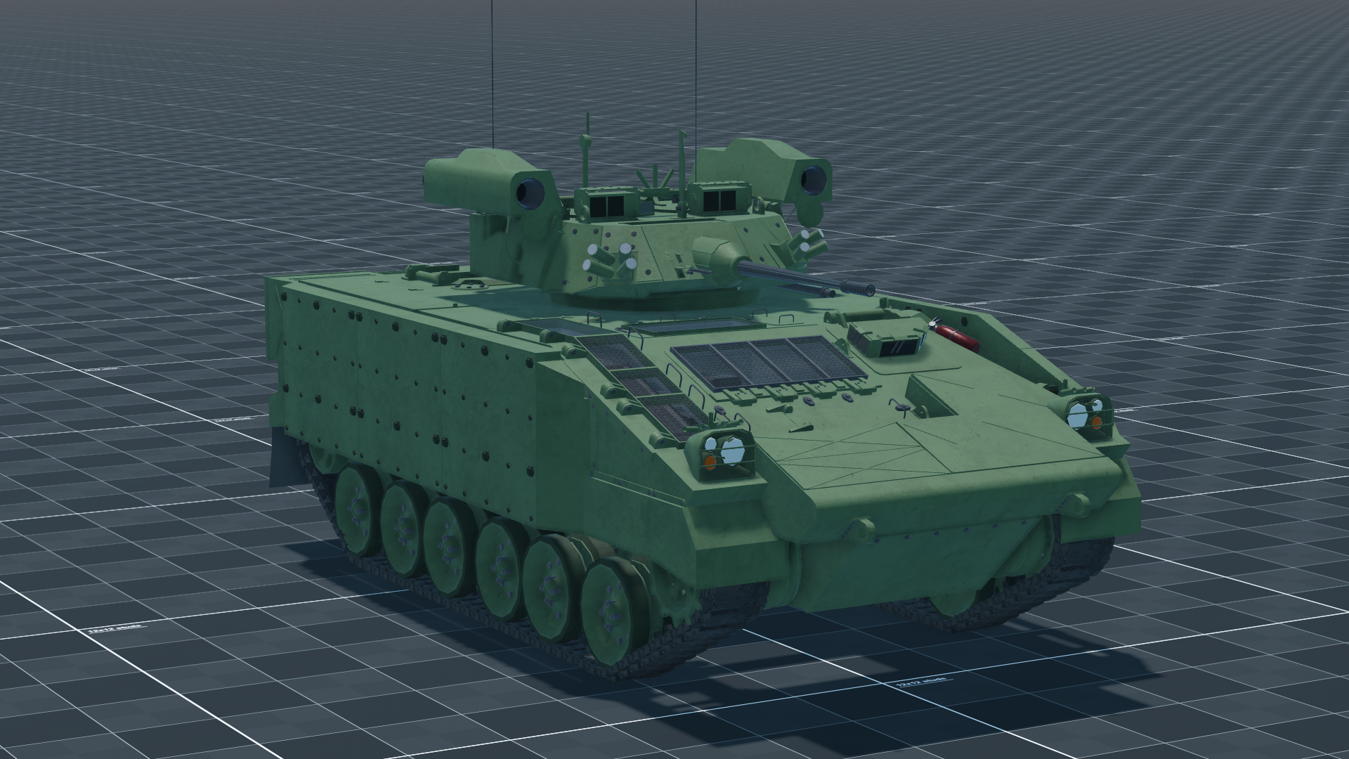 The turret has a stabilizer, smoke grenades, 7.62mm M240 coaxial, and a fire control system with laser rangefinder, lead, and Gen 2 green thermals (3.3x–10x). The commander has a stabilized sight with laser and 2x–8x zoom.