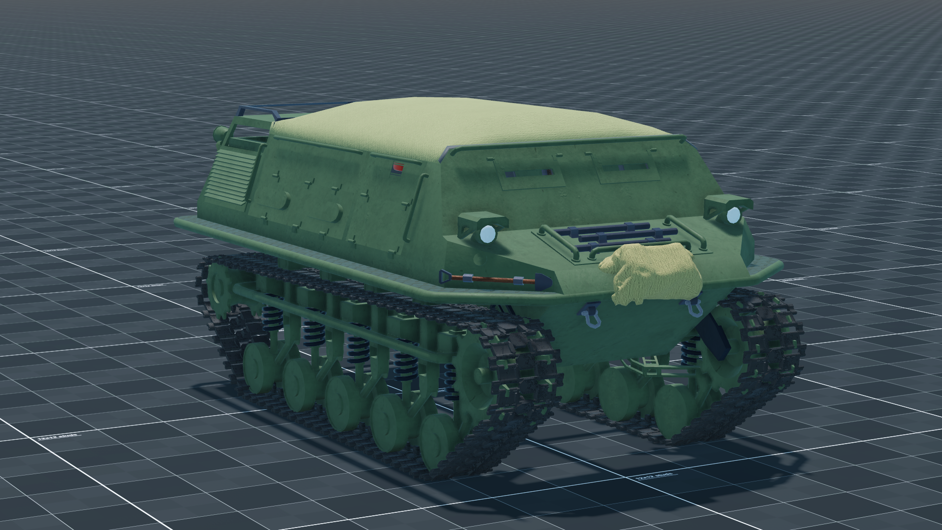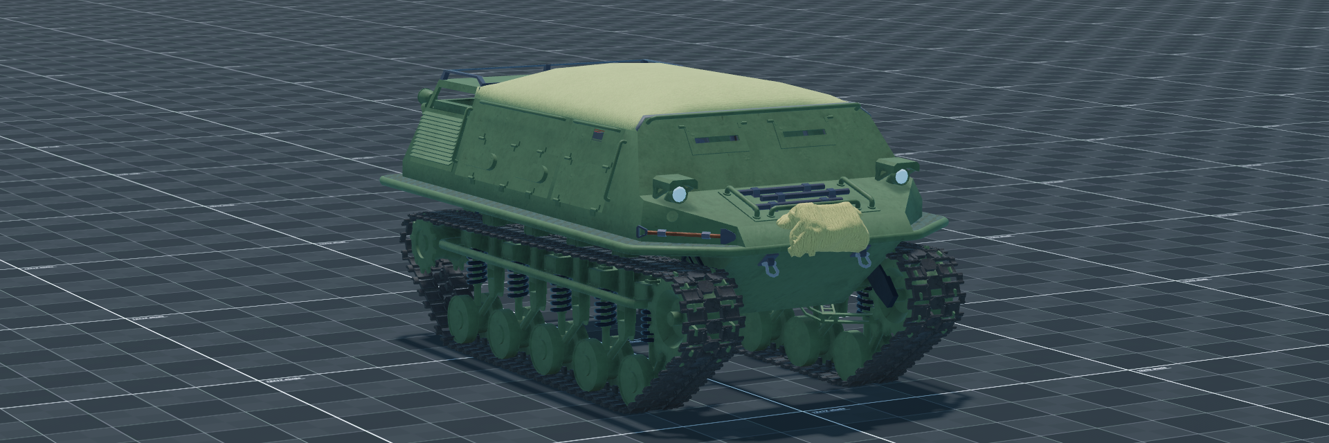 The Plastun SN is a tracked Transport Vehicle — a light armoured personnel carrier capable of carrying six passengers plus driver and gunner, with optional armament. The design emphasizes low weight and high mobility for air-mobile or reconnaissance use. Weighing just 3.8 tonnes, it is crewed by a driver and gunner with seating for six passengers; an optional 12.7mm DSHK mount can be fitted. The VAZ-3416 diesel produces 80 hp for 21.1 hp/t and a top speed of 50 km/h. With minimal armour and no standard main armament, the PlastunSN relies on speed and small size to deliver or extract infantry; the airdrop addon allows deployment from aircraft for rapid insertion.