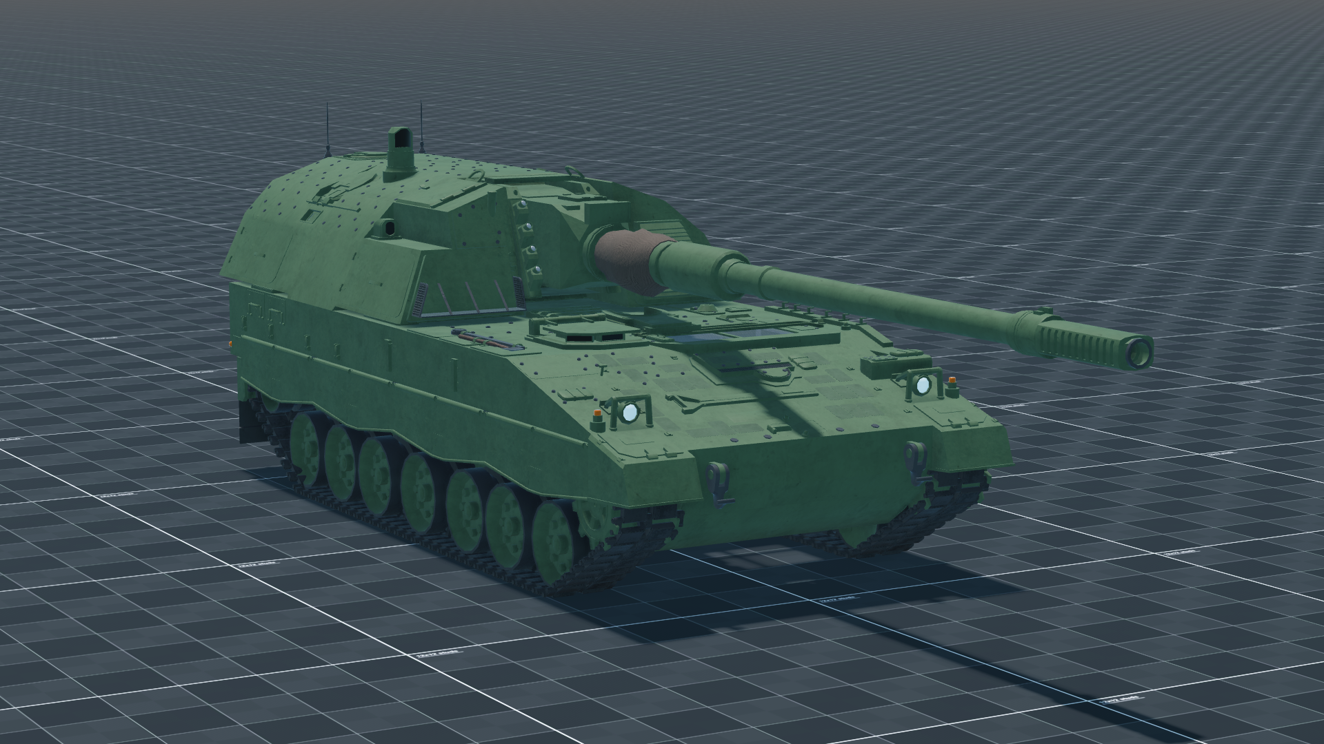 The 155mm L62 howitzer has a 3.14 s reload and a wide selection of charges and projectile types (including DM121 and DM702A1). The gunner has smoke grenades and an FCS with laser rangefinder and 8x zoom; the commander’s sight offers 2x–8x with laser.