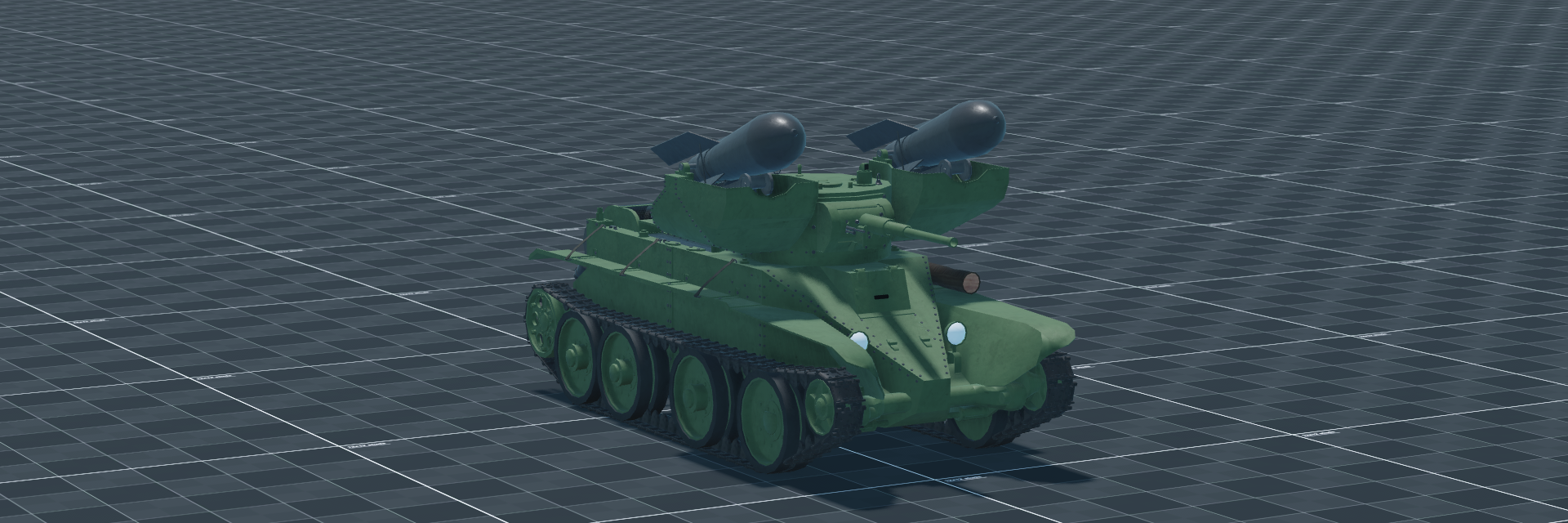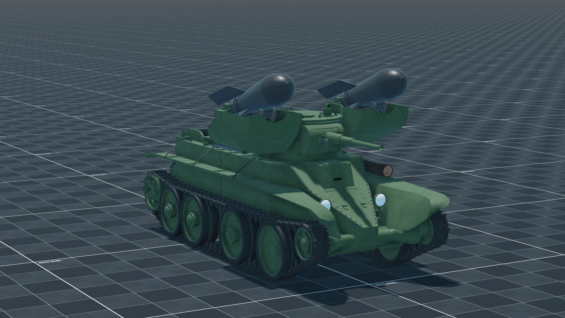 The RBT-5 is a Light Tank, a Soviet interwar experiment that fitted the BT-5 with two TT-250 “tank torpedoes” — large demolition rockets for breaching fortifications — in addition to its 45 mm gun. Only a handful were built. In-game it is a tracked vehicle weighing 11.5 tonnes with a crew of three (driver, gunner, loader). The M-5-400 diesel produces 400 horsepower (34.8 hp/t) for 51 km/h.